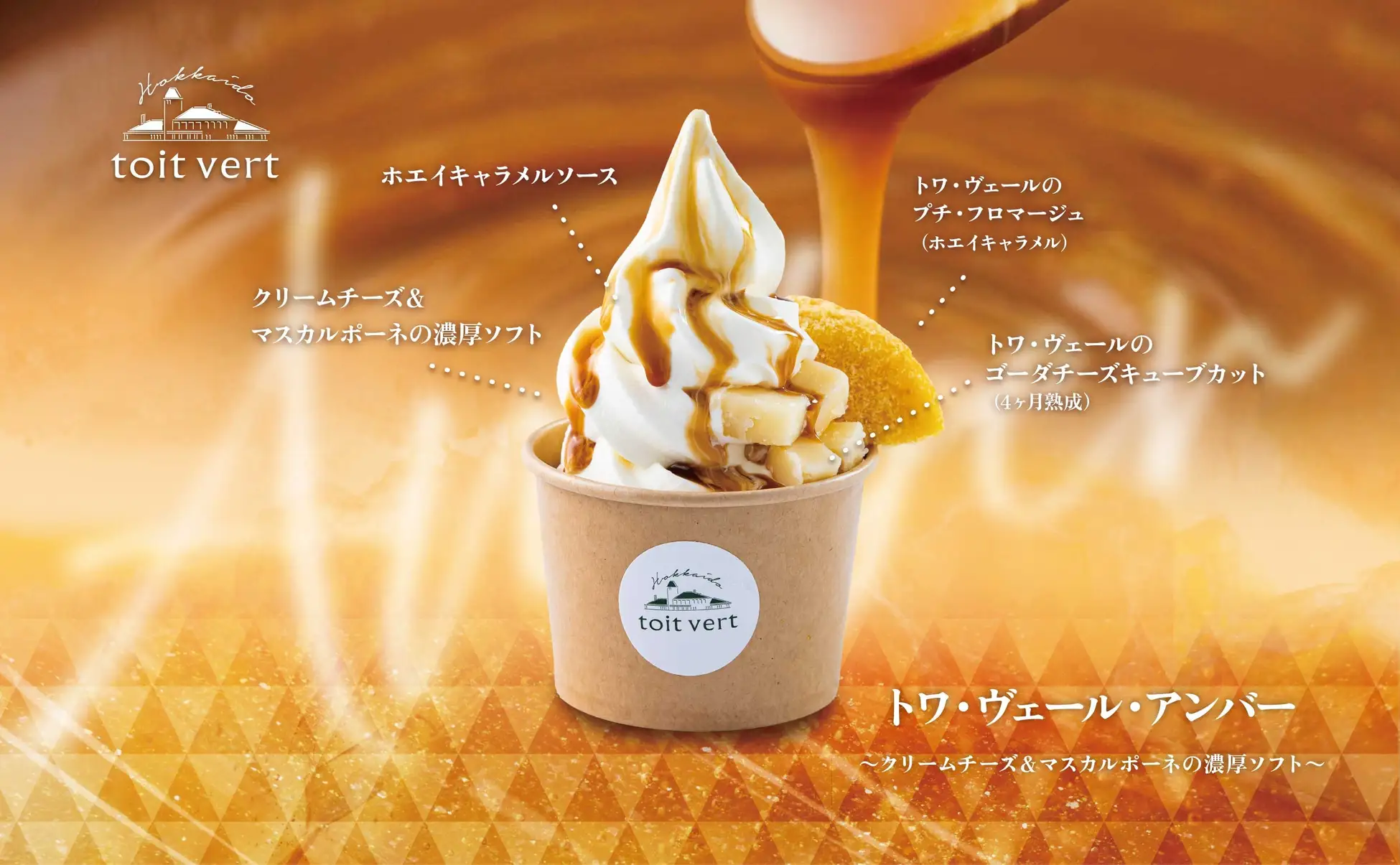 クリームチーズとマスカルポーネを贅沢に使用した濃厚なソフトクリームをベースに、4ヵ月熟成させた自慢のゴーダチーズをキューブ状にカットしてトッピング。さらに、チーズの旨味が溶け込んだ自家製ホエイキャラメルソースをたっぷりとかけました。